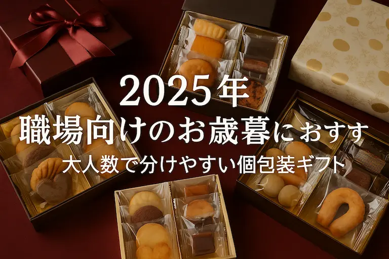 個包装された焼き菓子の詰め合わせギフトが並ぶ背景に、2025年 職場向けのお歳暮におすすめ・大人数で分けやすい個包装ギフトと表示されたデザイン画像。